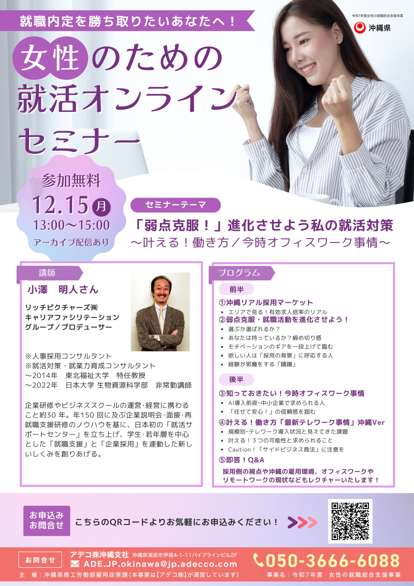 本セミナーでは、沖縄の採用マーケットのリアルから、弱点克服の就活対策、今時のオフィスワーク事情、最新テレワーク動向まで幅広く学べます。